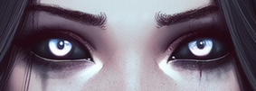 Ses yeux sont un mystère. Ils attirent l’attention de ceux qui les aperçoivent : leurs sclères sombres et leurs iris gris argentés leur donnent un éclat étrange, difficile à soutenir. Elle porte souvent un léger voile pour les dissimuler sans pour autant créer d'impair dans sa perception. Ils représentent un héritage dont elle a honte.